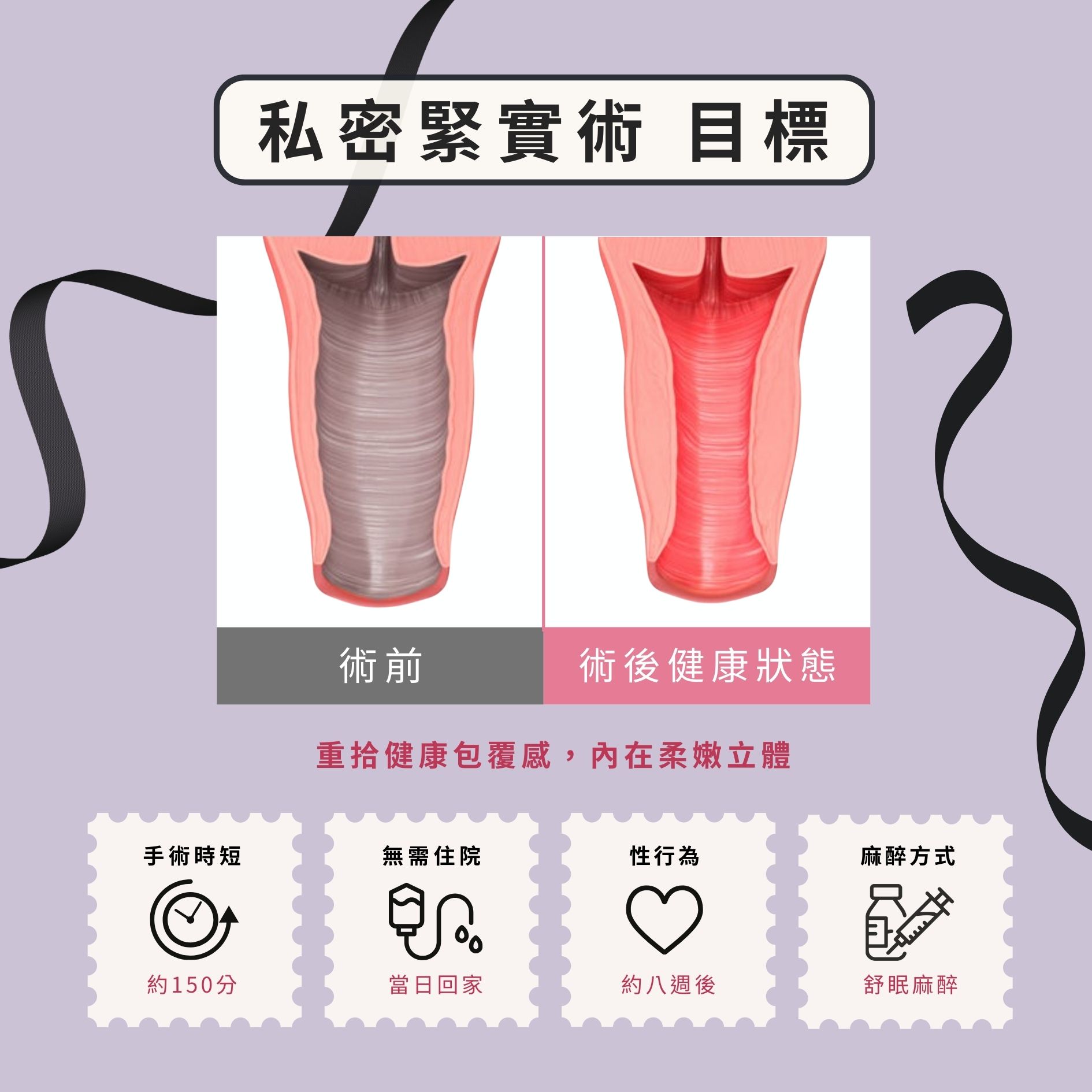 私密處狀況每個人都不一樣,詳細手術內容需要經由專業婦科醫師當面評估問診,給予客製化與完整的療程建議,姐妹們不用害羞,歡迎預約諮詢!加入詩宓診所LINE或來電 02-25012349洽詢。